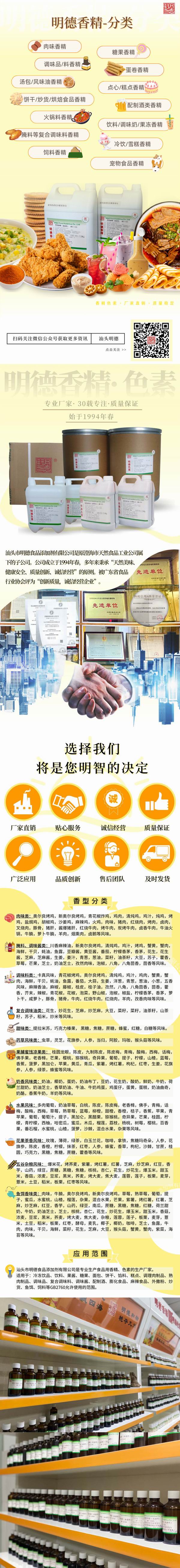 適用范圍:果醬、糖果、餡料、夾心、餅干等焙烤食品、調(diào)味料、膨化食品、外撒粉及蜜餞類等GB2760允許添加食品用香精的食品。